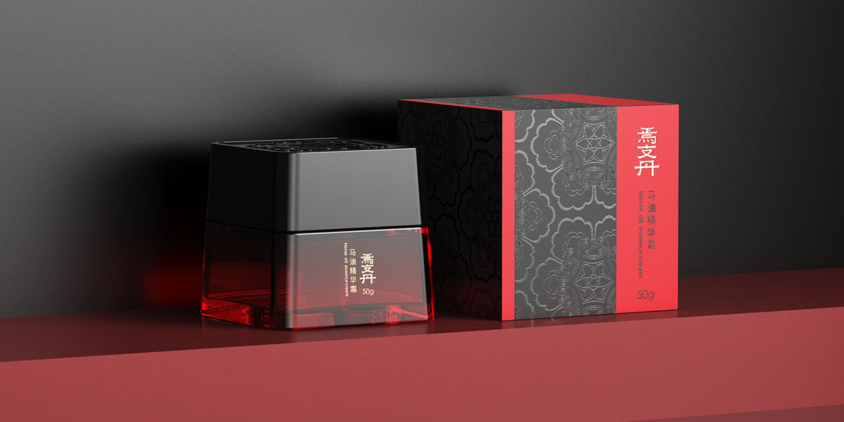 本方案增加兩種不同面霜瓶與包裝設(shè)計。左邊采用硬卡天地蓋形式,瓶身采用紅黑漸變,連接黑色瓶蓋,瓶蓋采用寶相花紋刻印,增加細節(jié)與層次感。天地蓋硬卡盒版設(shè)計增加馬頭燙金墊板,呼應(yīng)品牌“馬油”印象。采用漆器紅黑配色,打造漢唐視覺效果,體現(xiàn)低調(diào)奢華的貴族氣質(zhì)。