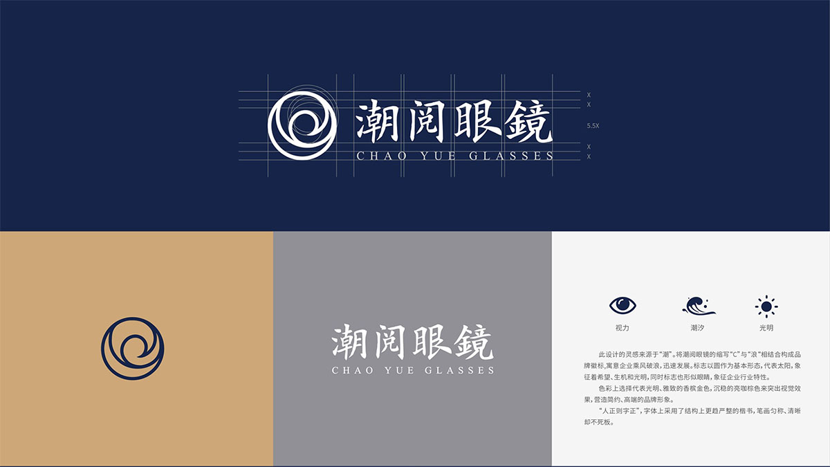 本次品牌設(shè)計靈感來源于“潮”,將潮閱眼鏡的縮寫“C”與“浪”相結(jié)合構(gòu)成品牌徽標,標志以圓作為基本形態(tài),代表太陽,象征著希望、生機和光明,同時標志也形似眼睛。色彩上選擇代表光明、雅致的香檳金色,沉穩(wěn)的亮咖棕色來突出視覺效果,營造簡約、高端的品牌形象。