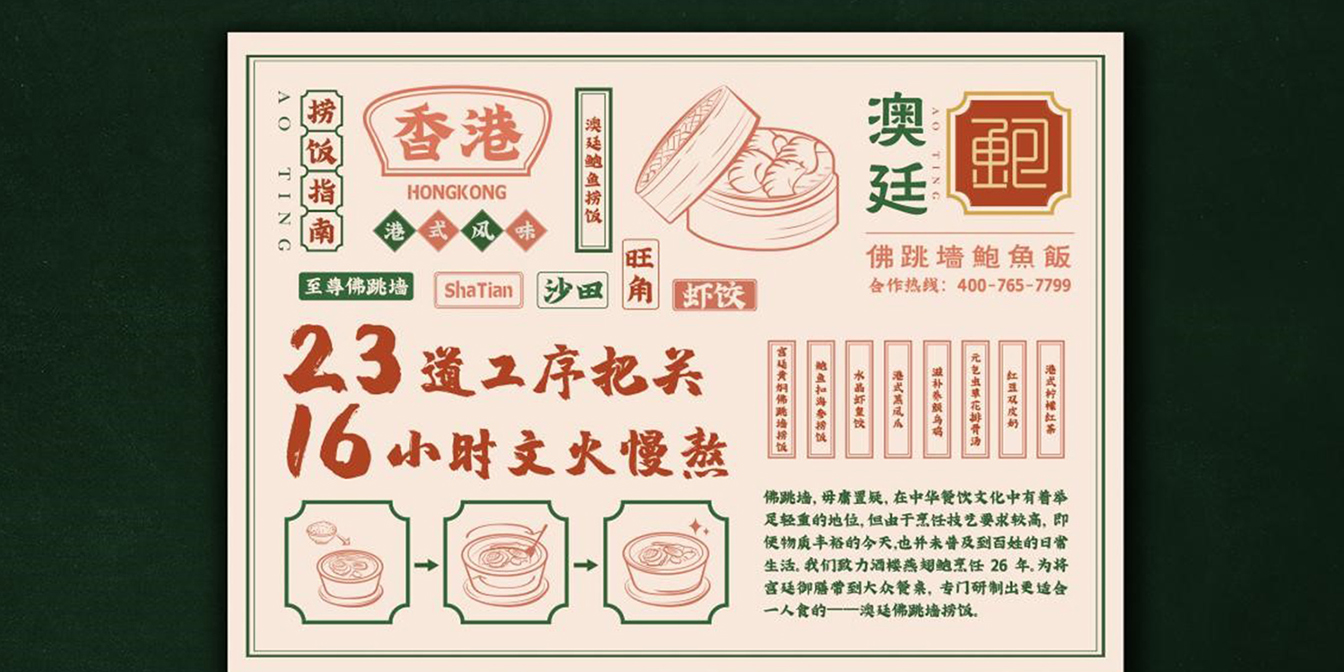 在澳廷佛跳墻鮑魚飯品牌策劃中,木馬設計將“鮑”進行字符號化,品牌形象以“鮑魚專家”為主題,結合中式的窗格元素,并因針對年輕白領消費消費人群 ,使用年輕化、符號化的logo。色彩上運用對比色紅色與綠色結合,使品牌形象脫穎而出。