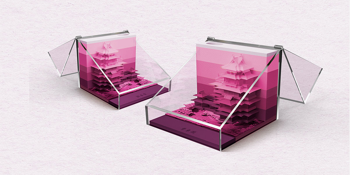 紫東閣融合古典意蘊,韻調(diào)南北、兼蓄古今,充分體現(xiàn)了“中而新”、“古而新”的設計理念。此次便利貼設計以紫東閣建筑為設計著眼點,將便簽紙與立體紙雕相結合,以紫色漸變?yōu)橹黧w配色,營造出較強烈的視覺氛圍。同時,凸顯紫東閣的歷史厚重,文化積淀。