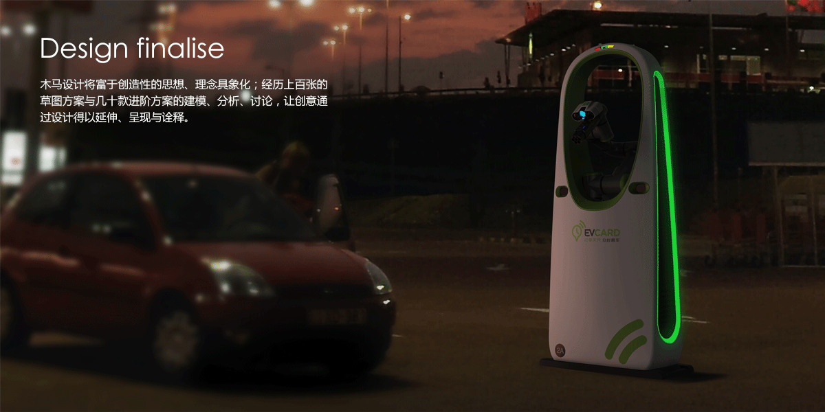 此款自動充電樁設(shè)計(jì)致力于簡化電動汽車的充電過程,給用戶帶來更便捷、更安全的操作體驗(yàn)。產(chǎn)品運(yùn)用了大面積的鏤空環(huán)繞造型,整體風(fēng)格更具親和力、綠色和科技感,在有效保護(hù)機(jī)械臂的同時,保證產(chǎn)品視覺上的完整性,充分展現(xiàn)了 EVCARD 的產(chǎn)品形象。