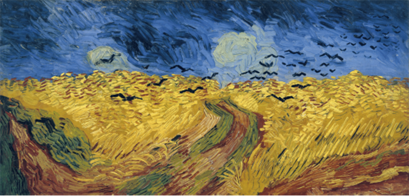 1890年7月27日梵高在麥田中開槍自殺。被槍聲驚起撲楞著翅膀遠(yuǎn)去的黑翅膀,就是他幾天畫《麥田群鴉》時(shí)見過(guò)的那群黑壓壓的鴉群。