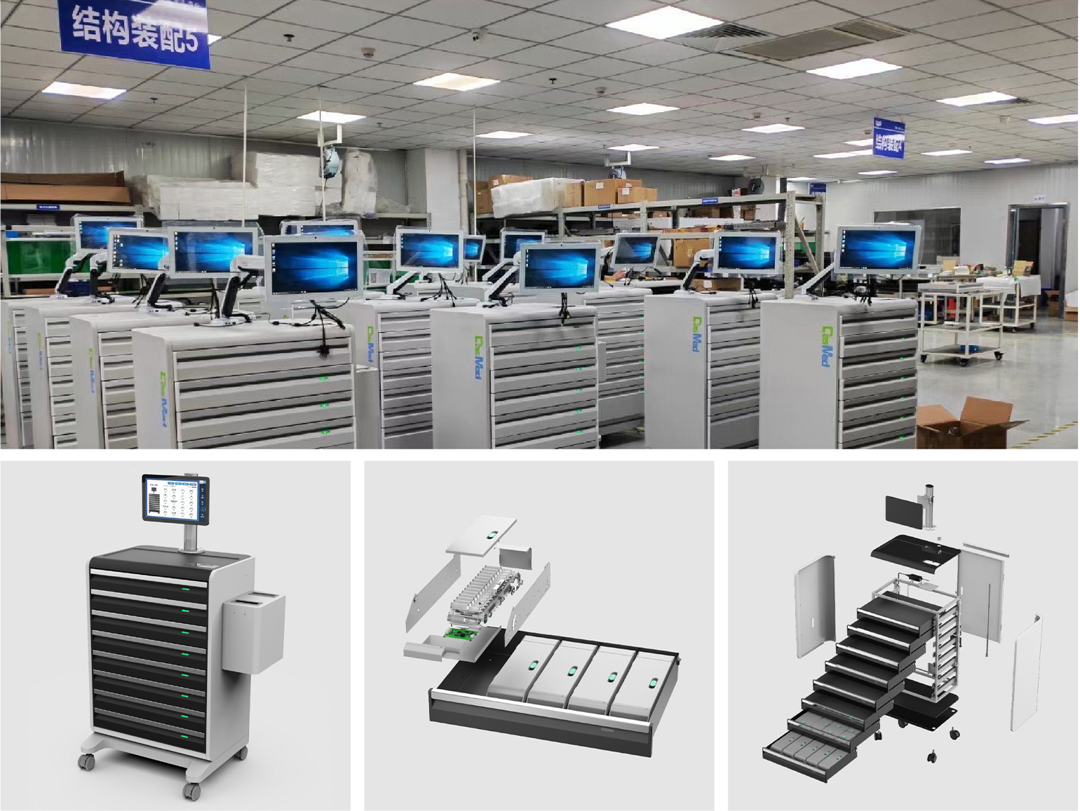 智能藥品管理柜通過(guò)大數(shù)據(jù)管理人員與藥品的取用信息,形成管理閉環(huán),極大提高藥品管理的效率和精度。項(xiàng)目團(tuán)隊(duì)針對(duì)實(shí)際應(yīng)用場(chǎng)景和不同種類(lèi)的藥品,開(kāi)發(fā)了藥品自動(dòng)計(jì)數(shù)模塊和單支送藥模塊、信息管理系統(tǒng)。整機(jī)外殼采用鈑金工藝,減少模具投入和制作周期,幫助客戶(hù)將產(chǎn)品快速投向市場(chǎng)。目前已在多家三甲醫(yī)院應(yīng)用。