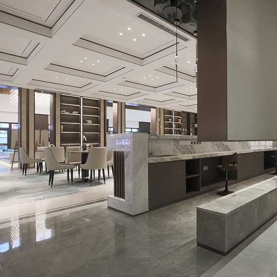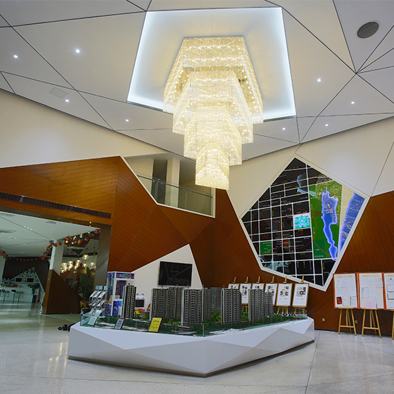 整體設計為凸顯明亮、簡潔、大氣,前臺顏色選用大理石材料,顏色偏向暖色調(diào),沙盤作為中心,大小規(guī)模適當,在燈光選了大型現(xiàn)代風格燈具,共同塑造出年輕、有活力的品牌形象,符合其年輕人的購房者畫像。