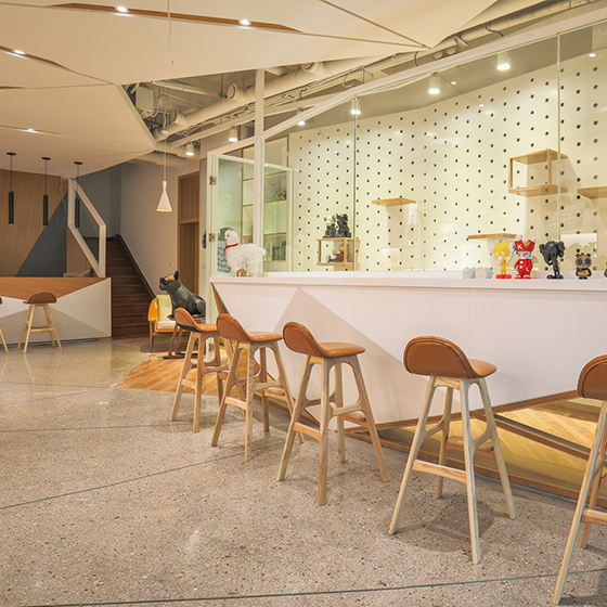設計整體采用暖色調(diào),木地板與地磚混搭,并用寵物玩偶擺件進行藝術點綴,在設計之初充分考慮寵物習性和人方便需求,層次豐富,打造人與寵物和諧共處的生活空間。