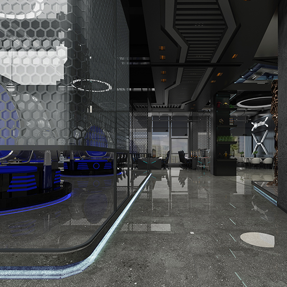 項目以科技、未來為設計主題,力圖擺脫網(wǎng)咖風格形式,通過暗色背景、燈帶、造型燈、幾何造型營造英朗科技感,根據(jù)功能分區(qū)劃分出觀賽區(qū)、競技區(qū)、對戰(zhàn)區(qū)等功能分區(qū),讓顧客更具沉浸感,暢游游戲世界。