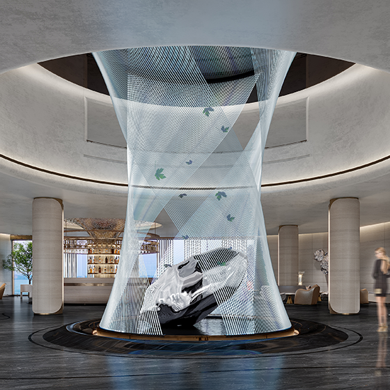 本案酒店位于濱海一側(cè),定位為精品假日酒店,在大堂設計上融合海景元素,大量采用波浪線設計,并在大堂中間設計了特殊景觀,起到畫龍點睛作用,并經(jīng)過深入規(guī)劃,完善各類房型,并設計了空中自助餐廳、宴會廳、健身房等功能區(qū)域,提升游客居住體驗。