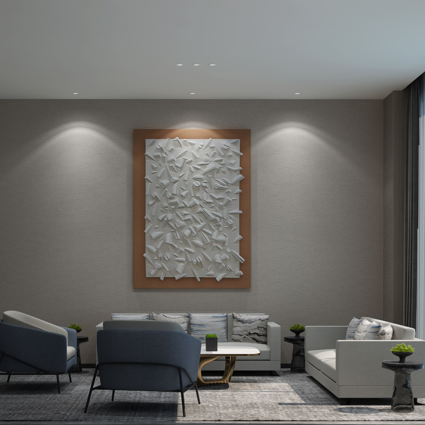 設計師以現(xiàn)代前衛(wèi)的設計手法讓酒店空間開闊、干凈、有序,而幾何線條的頂燈和對稱設計的射燈讓整體空間多出自由、活潑的感覺,版畫、切片裝飾畫、藝術擺件和綠植很好的弱化了現(xiàn)代風冷硬的氛圍,打造出有活力的室內(nèi)空間。