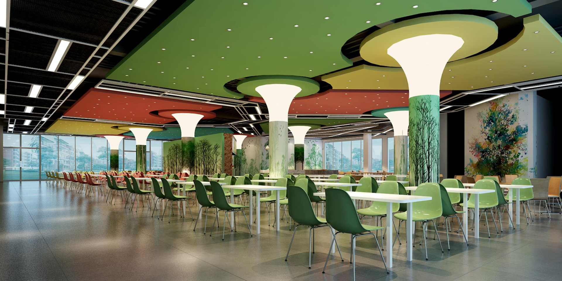 本案為突破傳統(tǒng)食堂就餐空間單調(diào)、乏味、無(wú)趣的現(xiàn)狀,在設(shè)計(jì)上大膽使用多種色彩,通過(guò)色彩體現(xiàn)大學(xué)生青春活力的精神面貌,并通過(guò)豐富的空間功能來(lái)迎合現(xiàn)代大學(xué)生餐飲文化的多樣化需求,區(qū)域的隔斷形態(tài)和細(xì)節(jié)的處理也進(jìn)一步強(qiáng)化了設(shè)計(jì)的獨(dú)特性。