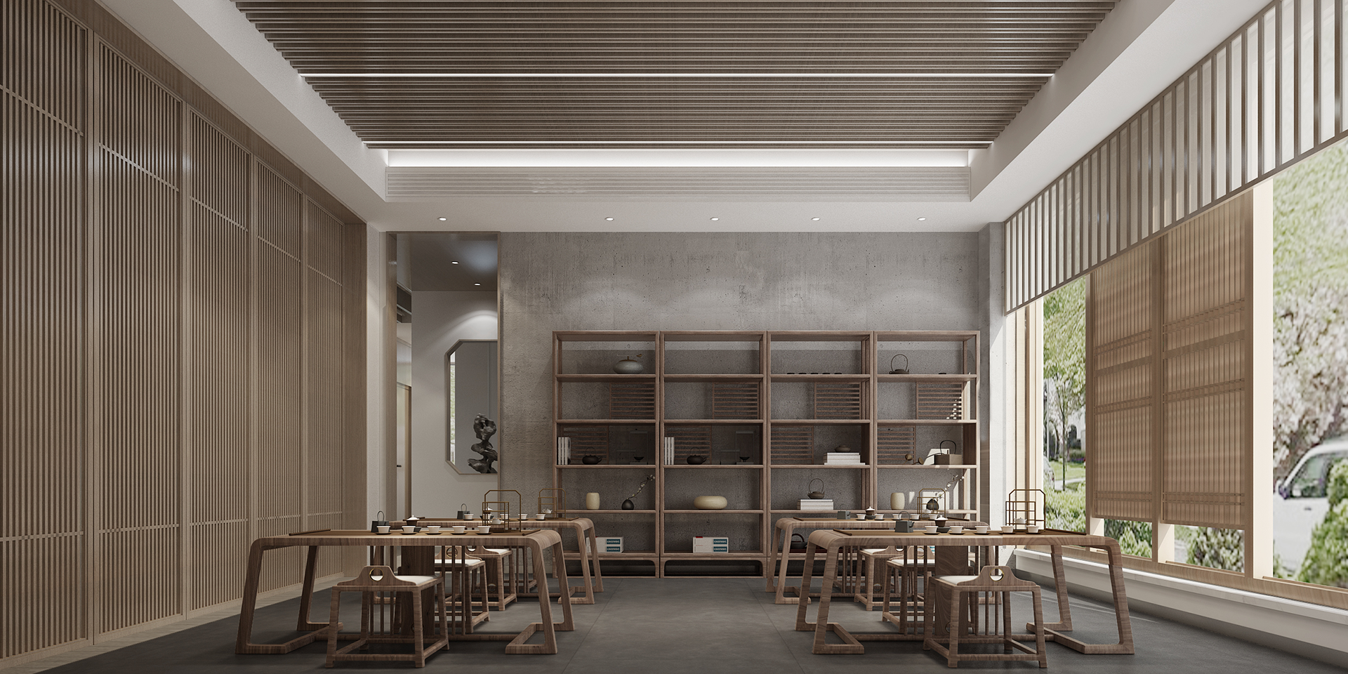 整體空間十分靜謐、幽雅、潔凈、舒適,產(chǎn)生了一種讓人隨遇而安的感覺。茶室追求微弱光線營(yíng)造的幽暗之美,陰影有機(jī)會(huì)游離于其中。通過(guò)最簡(jiǎn)單質(zhì)樸的材料和形式結(jié)合燈光的運(yùn)用,讓人更專注于茶湯帶來(lái)的感受和優(yōu)雅自如的深層次體驗(yàn)。