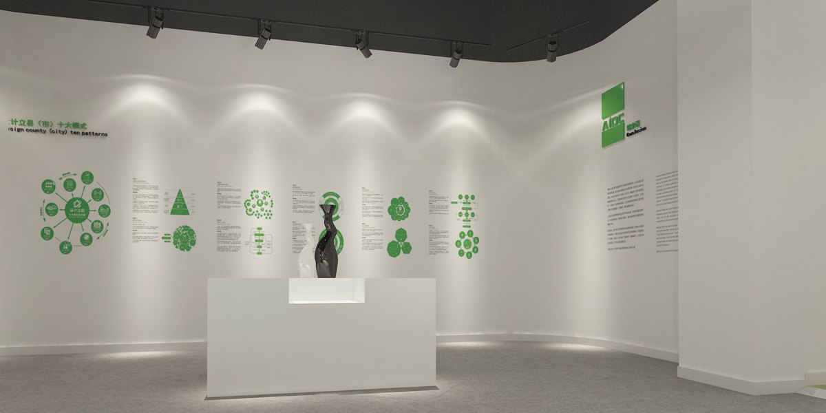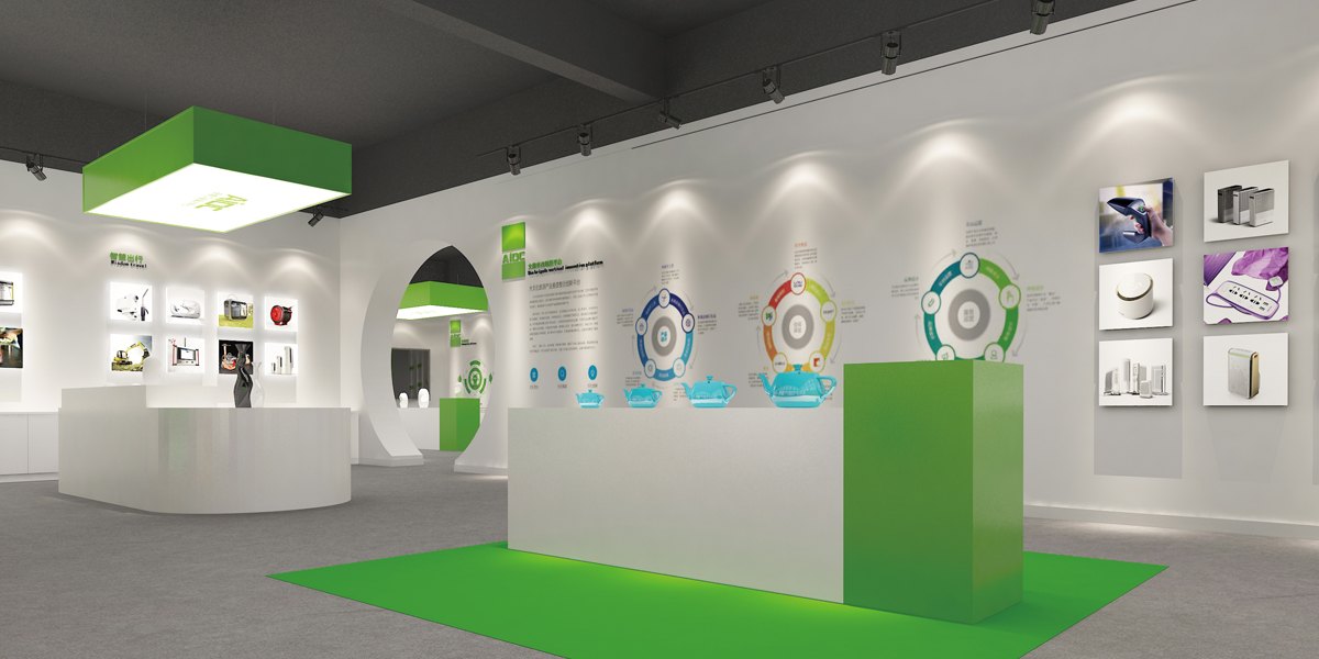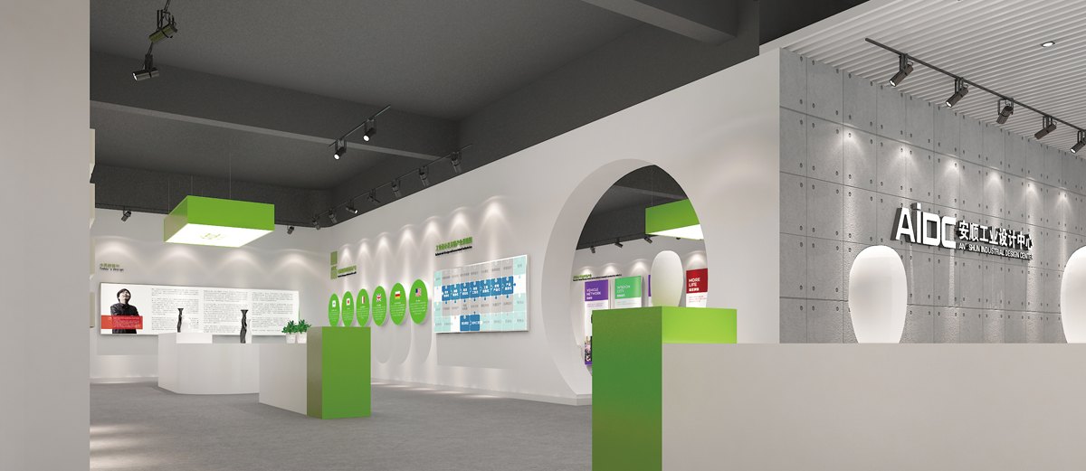 展廳功能區(qū)劃分為人工智能、智慧城市、生活美學(xué)、文創(chuàng)IP、醫(yī)療健康、裝備制造六大產(chǎn)業(yè)設(shè)計核心板塊,以品牌主色色塊分割串聯(lián)整個展示空間,使動線及路徑更加生動明晰。
