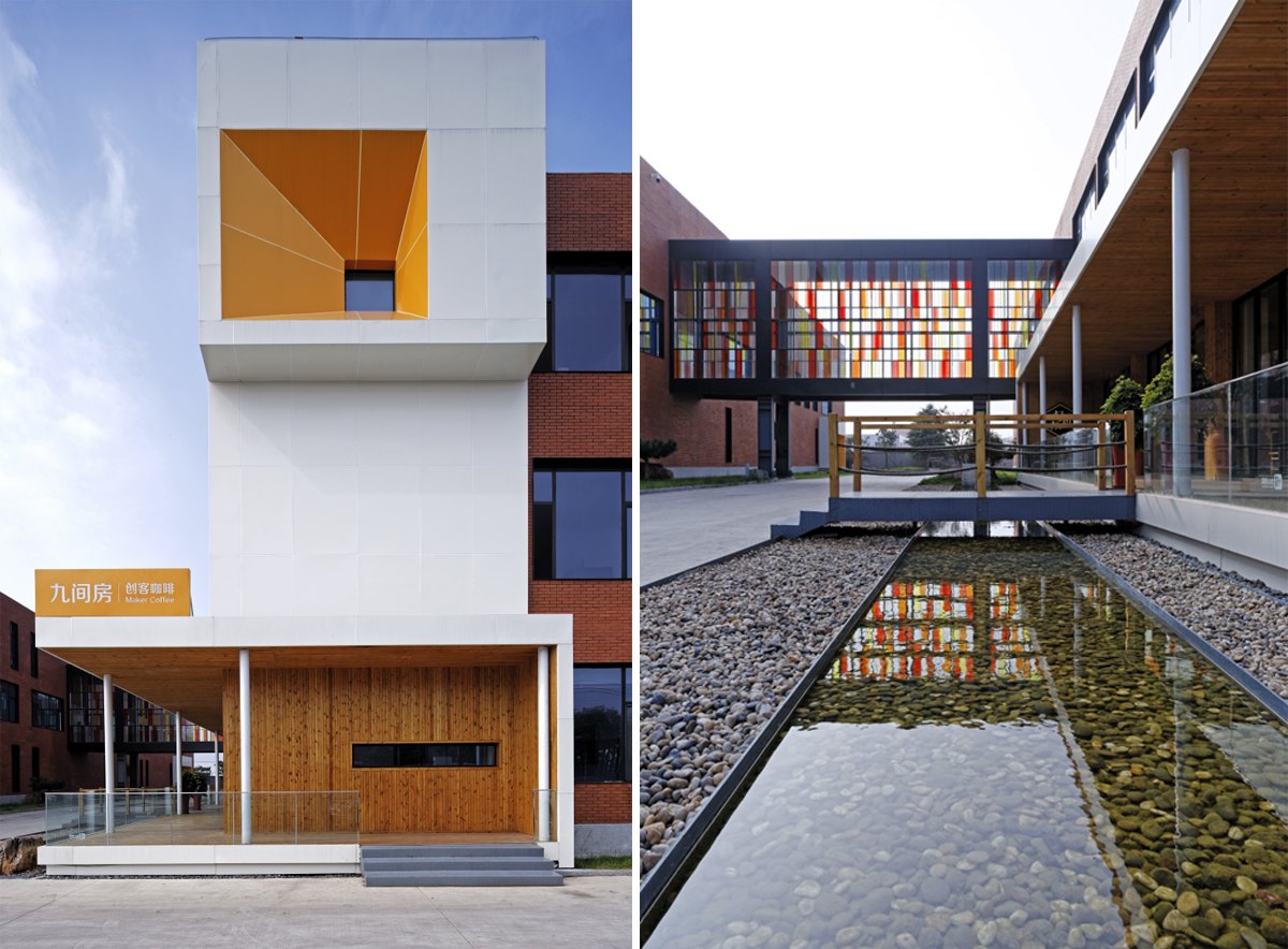 園區(qū)整體設(shè)計語言采用整體紅色為主的外立面,在白色造型和局部少量桔色塊、黑色窗套鋼構(gòu)等線條的搭配下充滿了熱情和明媚,化解了方形直線條為主的剛硬與冷漠。通過對原有舊廠房進行改造及重構(gòu),構(gòu)建以工業(yè)設(shè)計為核心的創(chuàng)新平臺。