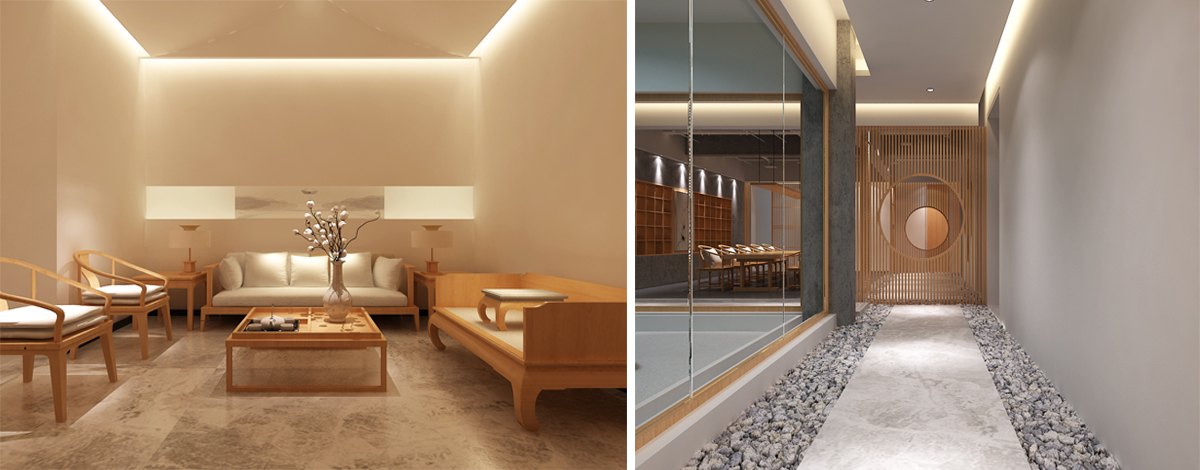 以禪茶貫穿整個(gè)會(huì)所裝修設(shè)計(jì)空間,通過(guò)儒、佛、道家對(duì)茶的不同領(lǐng)悟來(lái)確定空間的主調(diào)。利用枯山水、竹、鵝卵石、圓景、框景的設(shè)計(jì)元素,融入現(xiàn)代主義,透過(guò)材質(zhì)的形式變化,突出空間寧?kù)o超脫、通透別致的氛圍,還原消費(fèi)者所追求向往的世界。