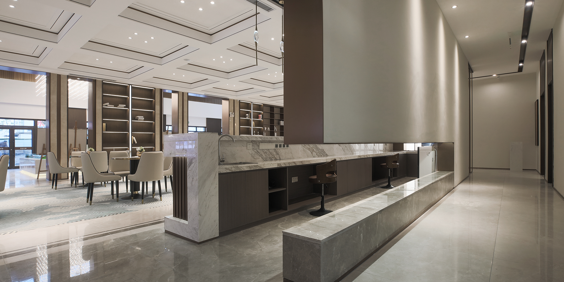 整體設(shè)計為凸顯明亮、簡潔、大氣,前臺顏色選用大理石材料,顏色偏向暖色調(diào),沙盤作為中心,大小規(guī)模適當,在燈光選了大型現(xiàn)代風格燈具,共同塑造出年輕、有活力的品牌形象,符合其年輕人的購房者畫像。